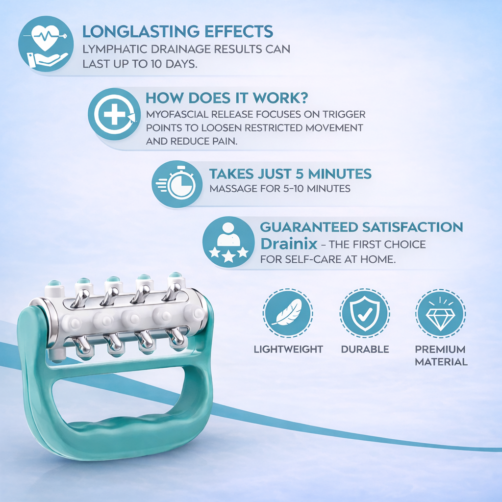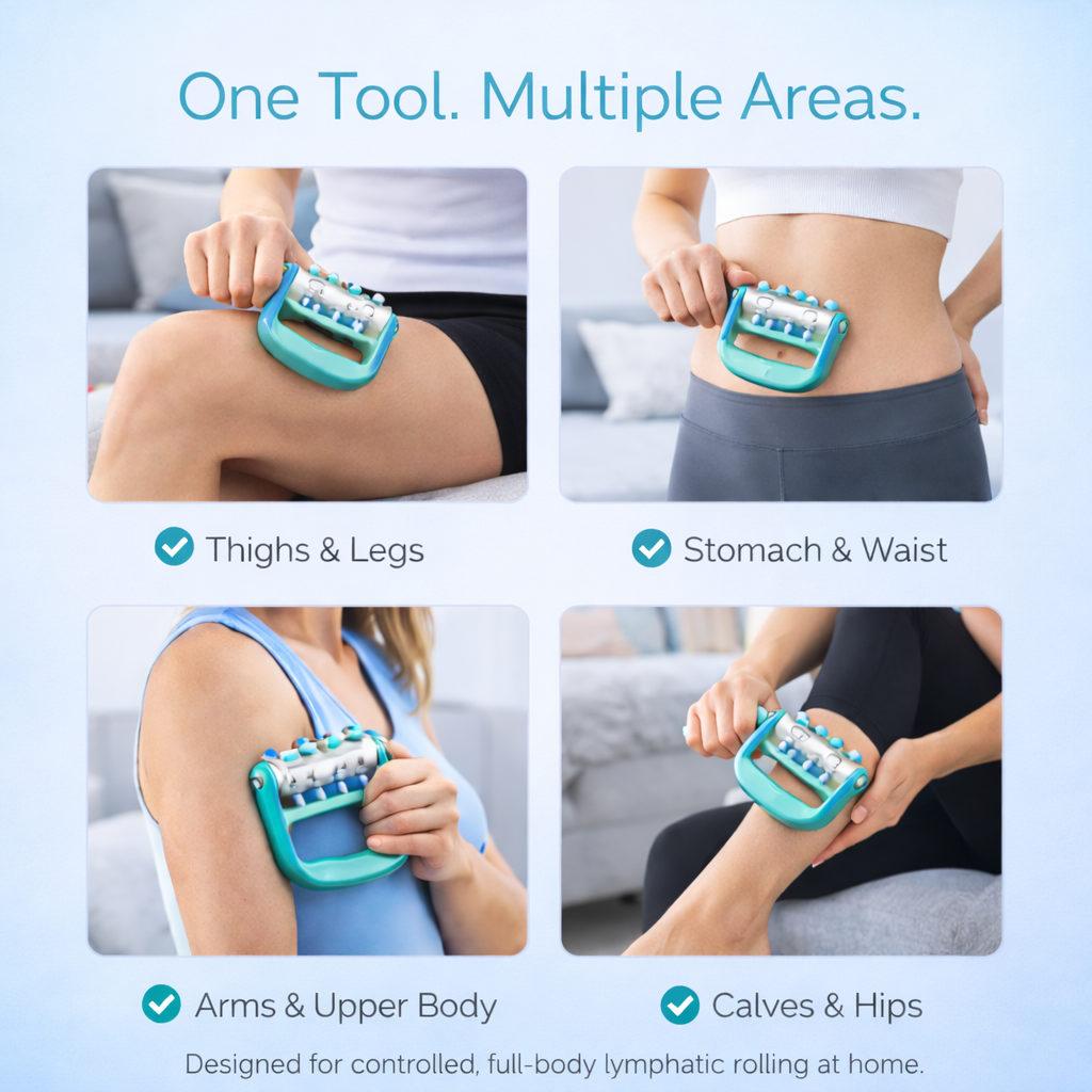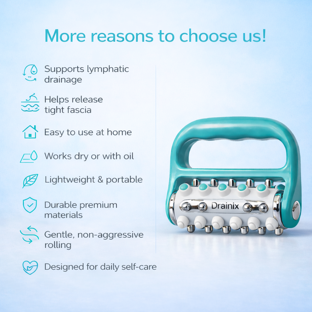 Drainix is built for comfortable, controlled at-home rolling — designed to support lymphatic flow and surface circulation without harsh pressure or painful tools.