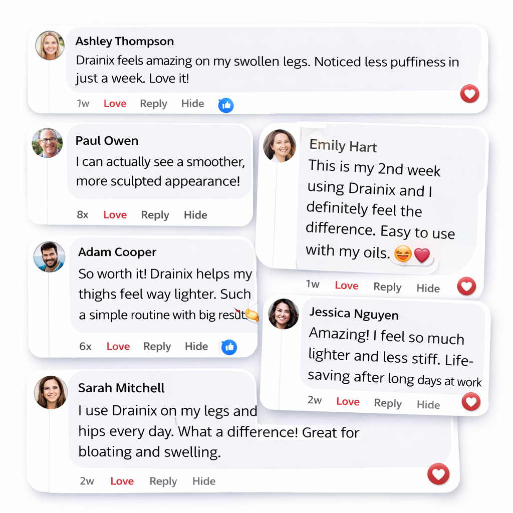 Drainix uses precision rolling technology to support lymphatic movement and improve surface-level circulation. This gentle, non-invasive stimulation helps reduce fluid buildup and promote a smoother, more balanced skin appearance with consistent daily use. Focused on controlled pressure and comfort — not aggressive or painful treatments — Drainix makes it easy to stay consistent and see real results over time.