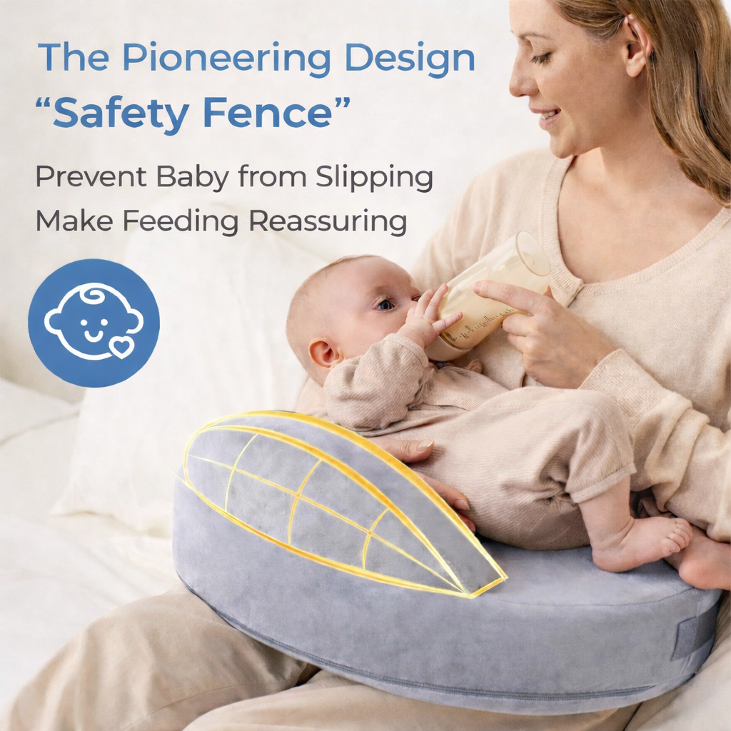 The safety fence is a raised barrier along the back edge of the pillow that creates a protective boundary, inspired by a mother's natural embrace. This structured design prevents your baby from rolling or sliding backward during feeding, giving you peace of mind and allowing one hand to stay free. The firm memory foam maintains consistent elevation, so your baby stays at the ideal height without shifting or sinking.