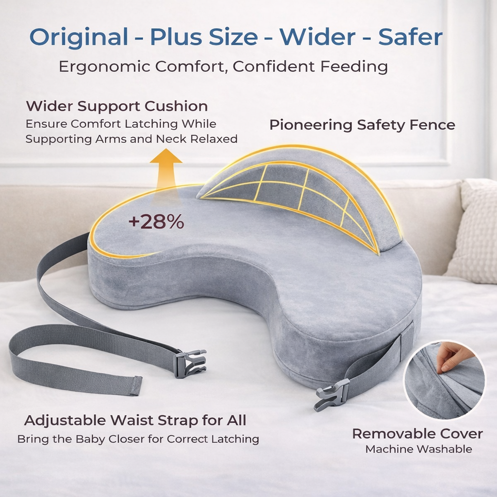 This engineered support system works to prevent baby slipping, eliminate muscle fatigue in shoulders and back, and maintain ideal latch positioning that reduces feeding frustration for both mother and baby.