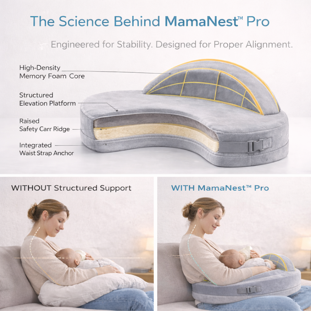 MamaNest™ Pro delivers firm memory foam stability that maintains consistent elevation throughout extended feeds — targeting the postural strain that develops from collapsed pillows, unsupported arms, and constant repositioning.
